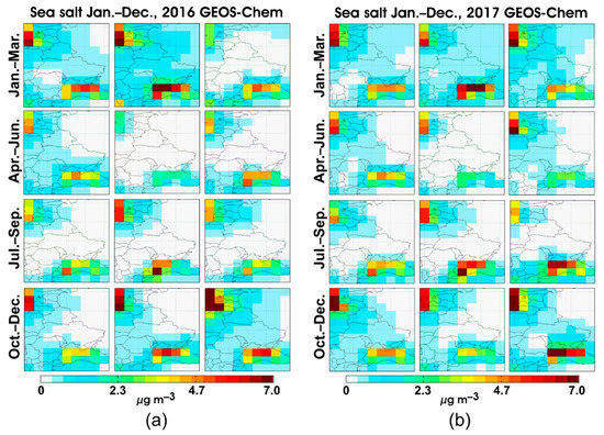 The spatial distributions of the monthly averaged concentration of sea salt in (a) 2016 and (b) 2017.