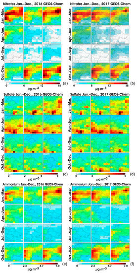 The data have been averaged monthly in 2016–2017 and are presented for each year. The PM2.5, mineral dust, black carbon, organic aerosol, sea salt, nitrate, sulfate, and ammonium distributions are discussed. For each cell in Figure 1b, Figure 2, Figure 3, Figure 4, Figure 5, Figure 6 and Figure 7, the average concentration in micrograms per cubic meter (µg m−3) is displayed through a color scale. For each aerosol type, the scale was chosen by accounting for the highest aerosol value, while the scale was different for each component and remained the same for one component for all 24 months. The seasonal behavior of the nitrate (NO3−), sulfate (SO42−), and ammonium (NH4+) aerosols is considered, with an emphasis on the cold (January), warm (July), and transitional (March, November) months.