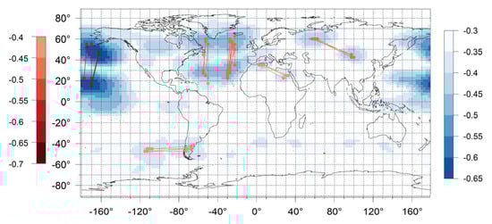 We applied our analysis on the basis of empirical Pearson correlation coefficients (hereinafter referred to as correlations), which are computed as follows. First, each of the Z500 time series was correlated with all the other Z500 time series. As a result, 37 × 144 correlation values were obtained concerning each grid cell from which the minimum value was selected and was referred as the strongest negative correlation [1,48]. Those were concentrated in several centers (i.e., local minima) as it is demonstrated in Figure 1 with blue-shaded dots. Then, pairs of grid cells were selected with identical strongest negative correlations indicating a one-to-one correspondence (i.e., mutually unambiguous correspondence between the selected grid cells). Each pair of grid cells connected two local minima. If the associated correlation value was statistically significant the pair can be the potential action center (hereinafter abbreviated as PotAC) of a single teleconnection. PotACs are also exemplified in Figure 1 with red circles, which are connected with red lines. In our analysis teleconnections were represented with PotACs, therefore teleconnections were considered as dipoles. Consequently, each grid cell of the PotAC represents a single pole of the teleconnection hereinafter referred to as pole.