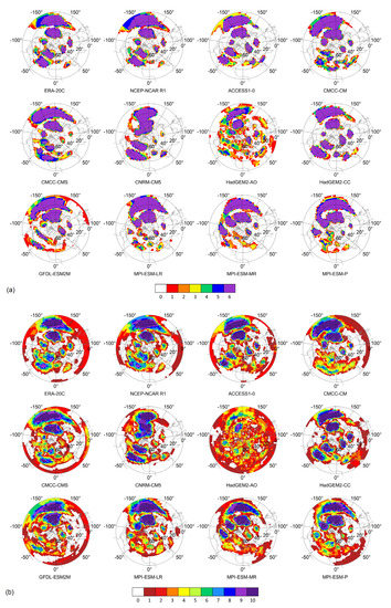 Stability patterns of selected reanalyses/GCMs (a) in the case of the 30-year-long periods and (b) in the case of the 10-year-long periods. The number of time periods with the strongest negative correlation below the 25th percentiles of all correlations is shown in each grid cell.