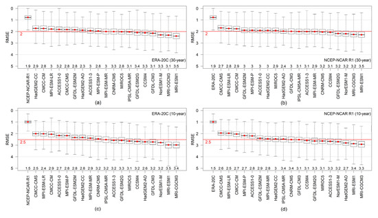 Distribution of root-mean-square error (RMSE) values with respect to (a,c) the ERA-20C and (b,d) the NCEP-NCAR R1 obtained from Monte Carlo simulations based on the stability patterns of (a,b) 30-year-long and (c,d) 10-year-long periods. GCMs are ranked according to their RMSE median. The ranges of the RMSE values are displayed above the × axis. The RMSE values that were computed by taking into account all grid cells in the Northern Hemisphere (NH) are plotted with red circles while the RMSE median of the GCMs is represented with a red straight line with the corresponding value.