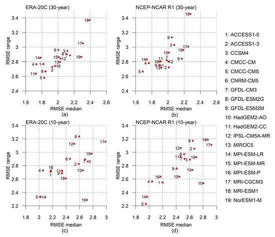 Characterization of GCMs in terms of their calculated RMSE medians and RMSE ranges in the case of (a,b) the 30-year-long periods and (c,d) the 10-year-long periods. The reference dataset is the ERA-20C in (a,c) and the NCEP-NCAR R1 in (b,d). GCMs with associated RMSE median below the RMSE median obtained from all GCMs in all four cases are denoted with triangles. The HadGEM2-AO and the MRI-ESM1 are considered as offscale GCMs, therefore those are omitted from (a,b) and from (c), respectively.