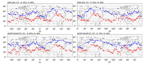 Loess regression curves of the ERA-20C (a,b) and the NCEP-NCAR R1 (c,d) plotted on maps with the (a,c) Atlantic view and (b,d) Pacific view. The curves are fitted on the southerly and on the northerly located potential action center (PotAC) poles denoted with blue and red circles, respectively. Explained variance (EV) of loess models in cases of southerly located PotACs (abbreviated as S) and northerly located PotACs (abbreviated with N) are indicated above the maps.