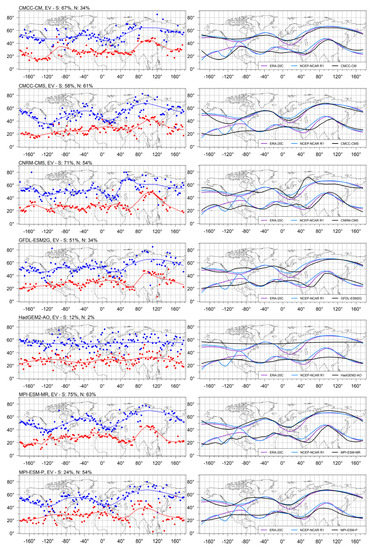 In the case of the GCMs, generally higher EVs can be computed for the loess models fitted in the southern belt than in the northern belt. Relatively low EV values were associated with the distribution of the PotAC poles, which were more scattered in some GCMs than in the reanalyses. A good example is the MPI-ESM-P with respect to the southern belt or the HadGEM2-AO for which the NH was mostly covered by PotACs (Figure S5 in the Supplementary Material). Due to this anomalous behavior those GCMs were unable to reproduce the shape of the loess regression curves obtained from the reanalyses.
