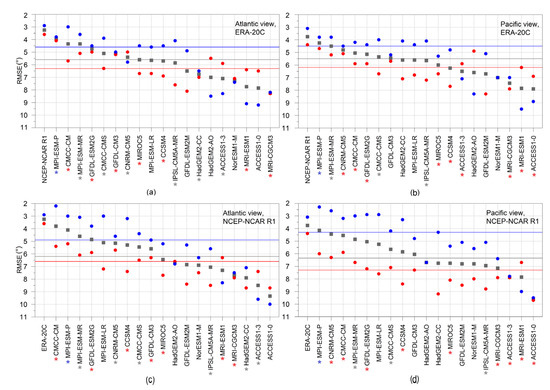 Comparison of the GCM loess regression curves with the reanalysis based loess regression curves on maps with the Atlantic view (a,c) and on maps with the Pacific view (b,d). The ERA-20C is used as a reference dataset in (a,b), while the NCEP-NCAR R1 is used in (c,d). Blue and red dots represent RMSE values represented by the northerly and the southerly poles, respectively, while grey squares indicate the average RMSEs. Red, blue, and grey straight lines denote the median GCM-performance (expressed by RMSE). GCMs with an EV at least around 50% are denoted with red, blue, and grey asterisks with respect to the southerly poles, the northerly poles and both poles of the PotACs, subsequently. The GCMs are ranked in decreasing order according to average RMSE values.