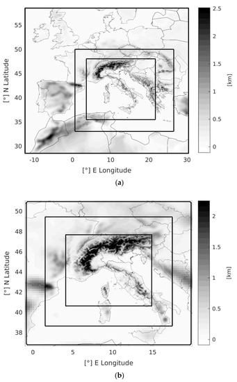 The WRF model [23] is a compressible non-hydrostatic model with mass-based terrain-following coordinates developed at the National Center for Atmospheric Research (NCAR) in collaboration with several institutes and universities for operational weather forecasting and atmospheric science research. This work adopted the WRF version 3.8.1 (Advanced Research WRF dynamic core) and the data assimilation package (WRFDA) version 3.9.1. The two different domain configurations used in the current study are both operationally used since 2018 at the CIMA (Centro Internazionale in Monitoraggio Ambientale) Research Foundation on behalf of ARPAL (Liguria Region Environment Protection Agency).