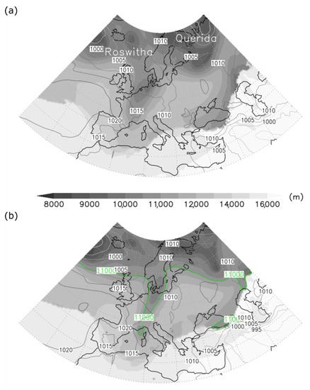 Mean sea level pressure (contours in hPa) and tropopause height (shaded contours in m) over Europe from the Global Forecast System (GFS) analysis (a) at 00:00 UTC and (b) at 12:00 UTC. The green contour shown in the panel below corresponds to the cutoff that occurred over the Ligurian Sea in the morning on 14 August 2018.