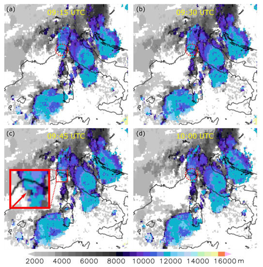 Cloud top heights above Italy and surrounding regions from the MSG (Meteosat Second Generation) satellite data. The retrieval time of images, every 15-min from 0915 UTC (a) to 1000 UTC (d), is indicated in each plot and the red (dashed) circle represents a wider region around Genoa.