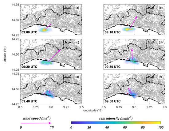 The results in Figure 6 demonstrate that the precipitation cell was moving north-eastward until 09:25 UTC, when the cell reached the coast. Once landed, the cell intensity decayed, its shape from approximately elliptical changed to an arrowhead-like shape pointing northward as it wedged along the Polcevera Valley. At the same time, the translation speed reduced to almost 2 m s−1, and the propagation direction backed almost 90° from 09:25 to 09:45 UTC. The translational speed of the cell approaching the coast was around 4 m s−1, with a highest speed being exceeding 6 m s−1 between 09:15 and 09:25 UTC.