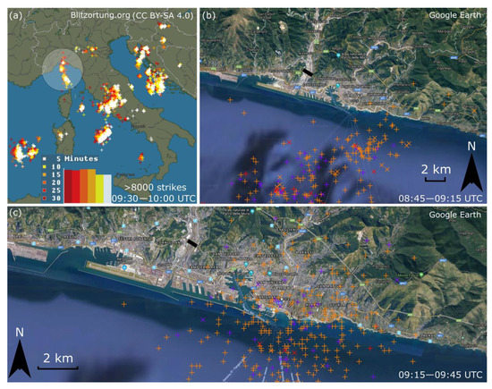 The position of lightning strikes measured through LAMPINET has an accuracy of 500 m (Figure 7b,c). In the bridge collapse hour, lightning strikes were mostly recorded over the sea (Figure 7b) and later over the coast and east part of Genoa (Figure 7c). The largest number of strikes occurred between 09:35 and 09:40 UTC at 4–5 km from the bridge, in the area around the Old Port of Genoa. The spatial extent of the cumuliform clouds in Figure 4 was predominantly in the west-east direction, which is not necessarily the dominant direction of the zone characterized by the highest frequency of lightning strikes around Genoa (Figure 7b,c). We also report that the lightning strikes were not observed by LAMPINET in the vicinity of the Morandi Bridge (thick black line).