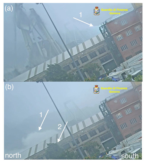 Even if quantitative measurements of weather conditions in the immediate bridge vicinity are not available, it is evident based only on the video available very close to the accident (released by the Italian Finance Guard on 1 July 2019 and taken from a security camera placed about 150 m to the west of the bridge), as well as many eyewitnesses, that severe weather conditions were present at the bridge around the time of the collapse. Figure 8 shows two frames extracted from the video at the time of collapse (Figure 8a) and few seconds immediately after the bridge had fallen (Figure 8b). The arrow in Figure 8a shows the lighting that occurred to the east-southeast of the bridge during the collapse, while Figure 8b depicts the cloud of dust and debris at the ground that was caused by the collapsed bridge (see Arrow 1). The finest particles in the dust cloud were suspended in the air and advected to the left of the photo by the wind that was blowing from south to north. Arrow 2 in Figure 8b shows the strong inclination of a tree to the left, therefore confirming that a strong wind was likely blowing at the time of the collapse. The full event recorded in the video, which is considered relevant to this study, is available at: http://www.gdf.gov.it/stampa/ultime-notizie/anno-2019/luglio/video-del-crollo-del-viadotto-polcevera-ponte-morandi-del-14-agosto-2018#null.