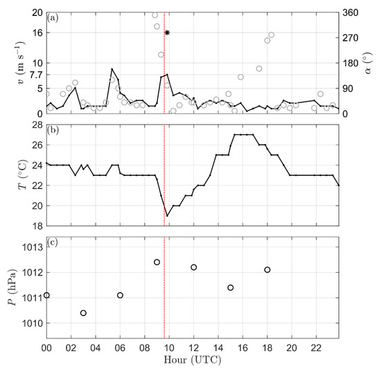 Meteorological measurements from the Genoa Airport weather station on 14 August 2018: (a) wind speed (black line; primary 𝑦-axis) and wind direction (grey line; secondary 𝑦-axis); (b) air temperature at 2 m above ground; and (c) sea level pressure at 2 m above ground. In (a), the asterisk symbol shows the velocity peak. The vertical red (dotted) lines indicate the bridge collapse time.