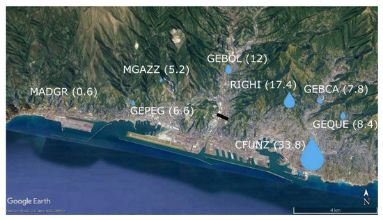 Accumulated surface precipitation between 09:00 and 10:00 UTC in Genoa. The accumulated precipitation at the CFUNZ station shown in mm h−1 and the size of other droplets scaled accordingly. Background map source: “© Google Earth”.