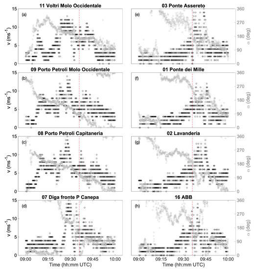 Wind speed (black dots; primary -axis) and wind direction (grey dots; secondary -axis) from 8 anemometers in the Port of Genoa. The vertical red (dotted) lines indicate the bridge collapse time. Panels (a)–(d) represent the stations west and south from the Morandi Bridge, while panels (e)–(h) are the stations southeast from the bridge (see Figure 2 for details).