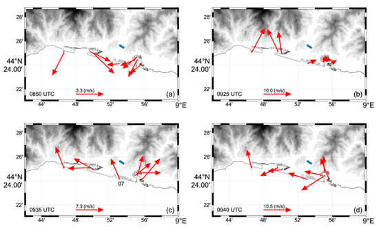Vectors of the wind velocity measured by the 8 anemometers in the Port of Genoa before (a) and during (b)–(d) the thunderstorm.