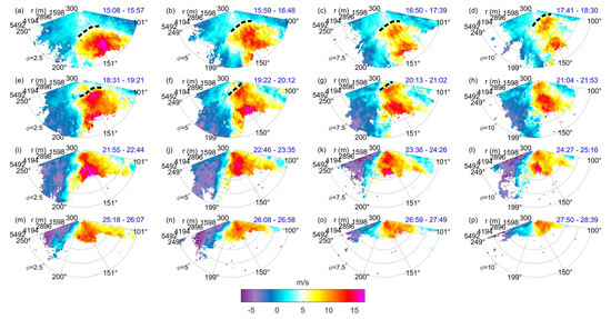 Doppler velocity measured by the WindCube Scanning Lidar 400S lidar located in the Port of Genoa. The beam elevation () and the scanning time interval in MM:SS (blue text; the hour in all plots is 09:00 UTC) provided in each figure. The black dashed line in (a)–(g) shows the leading edge of the maximum velocity region. (h)–(p) panels show the evolution of the thunderstorm outflow from 21:04 UTC to 28:39 UTC.