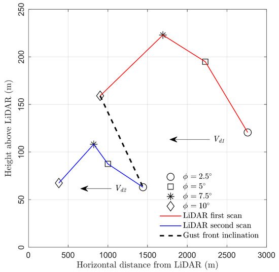 This displacement of the region of the maximum velocity with height is a characteristic of the radially advancing gust front of cold air in front of the thunderstorm cloud [42,43,44,45,46]. Further, Figure 13 enables the estimates of the displacement velocity of the gust front towards the lidar. Figure 14 shows the height ASL of the gust front (black dashed line in panels a–g) at different radial distances from the instrument along . For the height corresponding to 120 m ASL (i.e., 115 m above lidar level plus 5 m ASL, which is the height of the lidar ASL), we estimate the displacement velocity () of the gust front to be towards the instrument. A similar displacement velocity, , is obtained at 70 m ASL (i.e., 65 m above lidar). Thus, an average displacement velocity component towards the lidar is evaluated to be . Note that this velocity is about 1–2 m s−1 larger than the estimated velocity of the north-eastward propagation of the precipitation cell in the radar images (Figure 6). The displacement velocities calculated above are very similar to the one estimated by Mueller and Carbone [44] by tracking radar reflectivity and Doppler velocity of a gust front associated with a thunderstorm outflow measured in Denver, Colorado, USA, in 1984. They obtained a value of 6.9 m s−1.