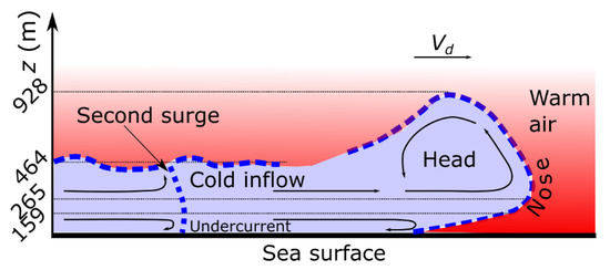 Further partial reconstruction of this event is possible by applying various relationships between the height of cold inflow () and other features of the gust front. According to several studies that investigated gust fronts at full scale or using physical experiments and numerical simulations (e.g., Reference [42,43,45,53]), the height of the leading edge (; called gust front head) is usually . This relationship enables us to further sketch the likely shape of the gust front that occurred over the sea approximately 15 min before the bridge collapse (Figure 15). The height of the gust front nose (265 m) is estimated from Reference [42], where it was reported this height is approximately . However, other relationships were proposed in Reference [53], too; hence, there is an uncertainty associated with this estimate. Recall that the height of the gust front nose is not the height of the maximum horizontal wind speed in the outflow. The maximum wind speed in downburst outflows is usually observed in the layer between 80 and 120 m above ground [54]. This is in accordance with the findings in Figure 13, which shows that the highest Doppler velocities are measured at the elevation . The slope of ~70° of the gust front head outline in the region above the gust front nose is simply adapted from Goff [53], while the gust front head height (928 m) is estimated through the relationship . The region behind the gust front head is characterized by pronounced turbulence due to the Kelvin-Helmholtz instability [55]; therefore, there is no clear outline of the gust front edge in that part (notice that the blue dotted lines are not connected behind the gust front head in Figure 15). In accordance with the gust front and downburst outflow theories [42,44,45,46], Figure 13c–h demonstrate that the gust front was associated with two high-speed regions that were separate with the zone of smaller wind speeds. The above-referenced studies demonstrated that the cold inflow typically comes in periodic surges, which is further schematically depicted in Figure 15.