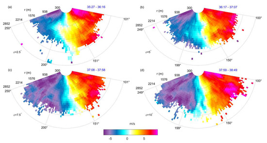 Doppler velocity measured during the time of bridge collapse by the WSL400s lidar located in the Port of Genoa. The beam elevation () and the scanning time interval in MM:SS (blue text; the hour in all plots is 09:00 UTC) provided in each figure (a)–(d).
