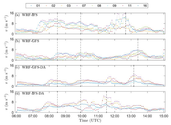 Maximum 5-min wind speeds at 10 m above ground at the eight anemometers location in the Genoa port (see Figure 2 and Figure 11 for anemometer locations and measurements, respectively): (a) WRF-IFS; (b) WRF-GFS; (c) WRF-GFS-DA; (d) WRF-IFS-DA. The vertical dashed lines show the time instances used for the analysis of radar reflectivity and thermodynamics diagrams.