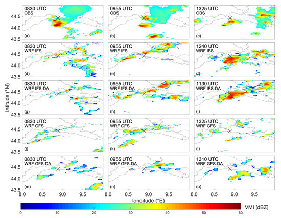 To gain a deeper understanding of this thunderstorm system, the Vertical Maximum Intensity (VMI) maps of radar reflectivity from the four WRF simulations were plotted at the time of the wind speed maxima indicated with dashed vertical lines in Figure 17. The first two peaks in all time-series are assumed to occur roughly at the same time in all WRF configurations, i.e., the velocity peaks at 08:30 and 09:55 UTC (Figure 17). The last velocity peak, which is also the most intense event, occurs at 1240 UTC in the WRF-IFS simulation, at 13:25 UTC in the WRF-GFS, at 13:10 UTC in the WRF-GFS-DA, and at 11:30 UTC in the WRF-IFS-DA. For further comparison between the mode and observations, Figure 18a–c show the VMI measurements at 08:30, 09:55, and 13:25 UTC and their modeled counterparts. The VMI observed at 12:40 and 13:10 UTC are not reported in Figure 18 because reflectivity patterns were analogous to the ones at 13:25 UTC (Figure 18c). In general, one can observe that there is no correspondence between the concurrent reflectivity patterns of numerical simulations and observations. This finding is not surprising because numerical weather prediction models often introduce a time and space shift between forecast and measurements. This bias is usually more pronounced for small-scale phenomena, such as a single-cell thunderstorm. Some deep convective spots with the VMI values above 40 dBZ occur in all the four WRF simulations at 08:30 and 09:55 UTC (Figure 18d,g,j,m,e,h,k,n), but these structures are rather small, organized along narrow stripes from southwest to northeast, and they do not resemble the VMI patterns in Figure 18a,b.