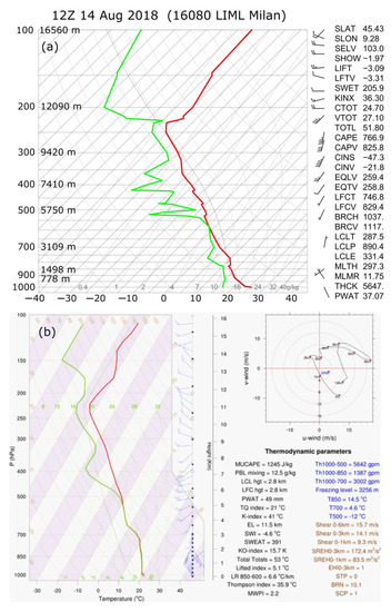 For comparison against WRF simulations, Figure 19a shows the radiosounding measurements at 12:00 UTC taken at Milan Linate Airport, which is approximately 120 km to the north-northeast of Genoa. In Milan, the air very close to the surface is drier with respect to the conditions simulated in WRF. This difference is expected because Genoa is along the sea, and, in August, the sea surface temperature is at the yearly maximum. Moreover, Figure 19b shows a profile extracted in the center of the cloud where the dew-point temperature depression is zero up to 500 hPa. Conversely, in Milan only a very thin cloud layer existed at about 600 hPa, which separated a mid-level layer of drier air between 700 and 800 hPa from a thicker high-level layer of dry air between 550 and 300 hPa. This upper layer is characterized by a nearly pseudoadiabatic lapse rate. A very similar thermodynamic behavior, both from qualitative and quantitative points of view, is observed in the WRF simulation above 500 hPa. The radiosounding profile recorded in Milan depicts the environment prone to wet downburst formation [57,58]. The higher moisture at the low levels due to sea evaporation around Genoa acted to reduce convective inhibition and played a role in increasing the probability of thunderstorm formation.
