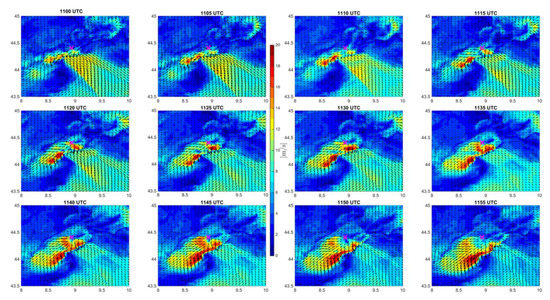 Recently, Burlando et al. [15] demonstrated that the majority of thunderstorm downbursts in this region are generated over the sea and then advance towards the shore. A similar trend in terms of downburst formation and movement was also reported by Burlando et al. [2] for a downburst event in the Port of Livorno, Italy, on 1 October 2012. As already discussed in relation to the METAR measurements presented in Figure 9, the gust front was relatively low-intensity as the maximum velocity recorded at all anemometer stations was in the order of 15 m s−1.