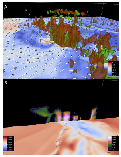 Figure 21a shows an updraft and downdraft (isosurfaces equal to ±1 m s−1) in combination with the maximum 10 m wind speed (shaded colors and vectors). The simulated radar reflectivity in the vertical plan is shown in Figure 21b. Similar to the earlier discussion, the WRF-IFS-DA results show an intense convective activity ahead of the Liguria coastline at 11:30 UTC. The larger scale cyclonic flow patter near the surface (Figure 21a) acts as the main provider of the inflow for the updraft in the forward flank of the thunderstorm. We also observe that the cold downdraft that originated inside the cloud reduces the air temperature at 2 m ASL upon its impingement (Figure 21b). The temperature difference between the cold pool and the ambient air around the thunderstorm is similar to the temperature drop of ~4 K (from 296 K (23.2 °C) to 292 K (19.0 °C)) that was observed at the Genoa airport station around the collapse time (Figure 9). This result also further validates the analytical procedure that was used in the derivation of Figure 15 in Section 3.3.