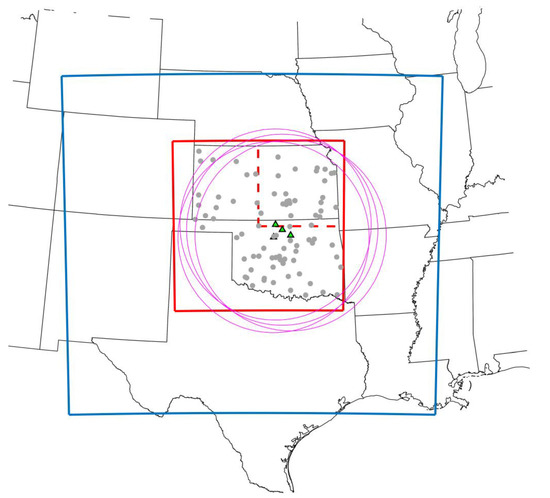 The WRF configuration consists of a single nest using a 550 × 500 grid point domain with 3 km horizontal grid spacing and 56 vertical levels. The model top is set at 10 hPa. To accommodate the SCW event being studied (see Section 2.4), the model domain is located over the south-central United States (Figure 1). For our study, the half-width of the horizontal and vertical localization radii [33] for conventional observations (radiosonde observations, aircraft reports, surface observations) is set at 230 and 4 km, respectively, while those for the AERI observations are set at 200 and 4 km, respectively (values arrived at after a period of parameter tuning). The localization is determined by the three-dimensional distance between the observation location and the analysis grid point. In other words, the analysis increment does not fill a cylinder determined by the horizontal and vertical radii given above, but rather an ellipsoid. The locations of the AERI sites (green triangles) and the respective full localization radii (magenta circles) are shown in Figure 1. A spatially and temporally varying adaptive inflation scheme applied to the prior state [34] is used to improve the dispersion of the ensemble (and to prevent filter divergence) for the duration of the DA cycling, and the outlier parameter is set at 3.0, meaning that observations whose observation-minus-background (OMB) value is greater than 3 standard deviations times the total spread are rejected. The DART configuration is summarized in Table 2.