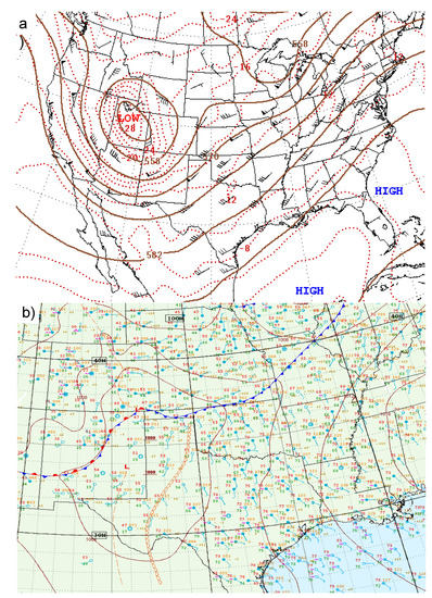 Summary of the synoptic weather situation on 18 May 2017: (a) 12:00 UTC 500-hPa heights (brown) and temperatures (red) courtesy of the Storm Prediction Center (SPC) and (b) 12:00 UTC surface analysis depicting surface fronts and dry line courtesy of the Weather Prediction Center (WPC).