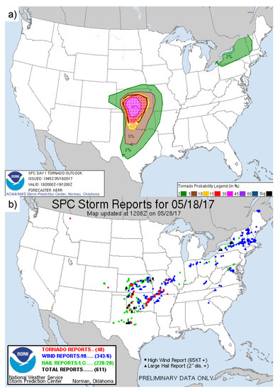 The synoptic set-up for this event is depicted in Figure 2. On the morning of 18 May, a vigorous mid-level vorticity maximum associated with a 500-hPa trough and closed low was situated over northern Utah, digging east-southeastward toward Colorado (Figure 2a). A cold front sagged from northern Missouri through Kansas into eastern Colorado then southwestward into Arizona. At the same time, a well-defined dry line was situated south-north across west-central Texas (Figure 2b). The cold front and dry line served as foci for convective activity that developed later in the day as they interacted with a shallow layer of warm, moist air flowing northward from the Gulf of Mexico and the favorable shear profile provided by the approaching vorticity maximum and trough. Given this set-up, the National Oceanic and Atmospheric Administration (NOAA) Storm Prediction Center (SPC) forecast a greater than 30% probability of tornadoes within 25 miles of a given point in central Kansas and Oklahoma (Figure 3a). Severe weather reports received by SPC indicate that 48 tornadoes occurred in two distinct bands: one oriented north-south from central Kansas to central Oklahoma (in the high-risk area mentioned above) and the other oriented southwest-northeast in eastern Oklahoma and Western Missouri (Figure 3b). In addition, there were numerous reports satisfying criteria for SCW (both with respect to hail size and wind gust magnitude) in this region.