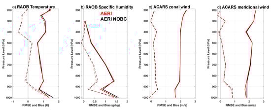 Comparison of analysis root mean square error (RMSE) (solid lines) and bias (dashed lines) for the AERI (red) and AERI NOBC (black) experiments. Errors and biases are averaged by vertical level over the duration of the nine-hour period of data assimilation (DA) cycling from 18:00 UTC 18 May to 03:00 UTC 19 May for (a) rawinsonde observation system (RAOB) temperature (K), (b) RAOB specific humidity (g/kg), (c) aircraft communications addressing and reporting system (ACARS) zonal wind (m/s) and (d) ACARS meridional wind (m/s).