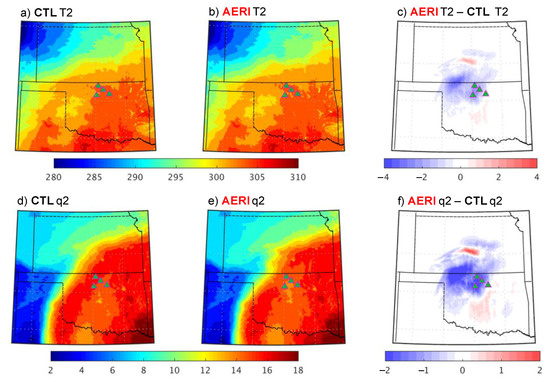 WRF-DART surface temperature (K) (a and b) and water vapor mixing ratio (g/kg) (d and e) ensemble-mean analyses valid at 19:00 UTC 18 May. Differences between the AERI and CTL experiments are shown in the rightmost column (temperature and dewpoint in c and f, respectively). Locations of AERI observing sites are depicted by green triangles.