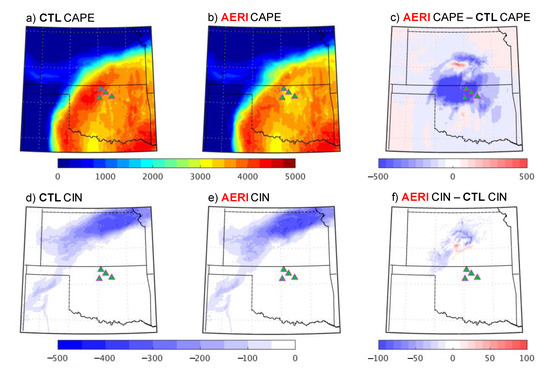 WRF-DART convective available potential energy (CAPE, J/kg) (a,b) and convective inhibition (CIN, J/kg) (d,e) ensemble-mean analyses valid at 19:00 UTC 18 May. Differences between the AERI and CTL experiments are shown in the rightmost column (CAPE and CIN in c,f, respectively). Locations of AERI observing sites are depicted by green triangles.