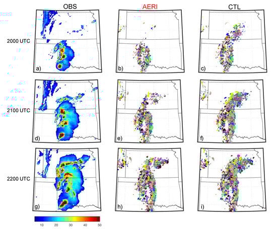 Observed composite reflectivity factor valid at (a) 20:00, (d) 21:00 and (g) 22:00 UTC 18 May. Also shown are paintball plots of simulated composite reflectivity factor ≥40 dBZ for WRF AERI ensemble forecasts initiated at 19 UTC and valid at (b) 20, (e) 21, and (h) 22 UTC as well as the corresponding CTL ensemble forecasts valid at (c) 20, (f) 21, and (i) 22 UTC.