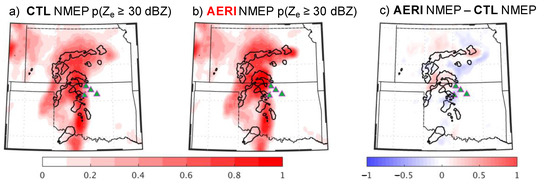 To examine whether CTL and AERI ensemble forecasts offer practical guidance regarding the location and timing of severe weather (and, indeed, whether AERI offers improved performance in this regard) we compared NMEPs computed using a threshold value of 50 dBZ with observed indicia of severe weather (in this case, the observed location of hail per SPC reports). Overall, neither CTL nor AERI seems particularly skillful in depicting the precise timing and location of hail threats (Figure 9). However, comparison of the two experiments does indicate that, at least in the downwind portion of the domain. AERI does show increased probabilities of intense convection (i.e., greater than 50 dBZ, known to be associated with an increased risk of hail) in the general vicinity of 7 hail reports in east central Kanas.