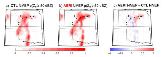 Neighborhood maximum ensemble probabilities (NMEP) for 1-h WRF forecasts initiated at 22:00 UTC and valid at 23:00 UTC 18 May. CTL forecasts (a) and AERI forecasts (b) are evaluated using a threshold composite reflectivity factor of 50 dBZ. NMEP differences (AERI minus CTL) are shown in the rightmost column (c). Reported locations of hail occurring from 22:53 UTC and 23:07 UTC are shown by green squares (per SPC reports). Note: AERI site locations are not shown to avoid confusion.