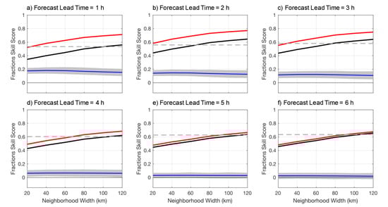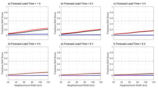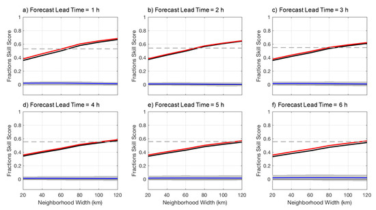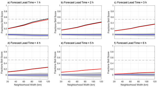 Fractions skill scores (FSS) for composite radar reflectivities ≥50 dBZ as a function of neighborhood width (where neighborhood width is one-half the neighborhood radius). FSS for CTL (black) and AERI (red) are aggregated by lead time—(a) 1 h, (b) 2 h, (c) 3 h, (d) 4 h, (e) 5 h, (f) 6 h—over all forecasts initiated from 19:00 UTC to 22:00 UTC. The difference between the AERI and CTL FSS is depicted by the solid blue line, and 95% bootstrap confidence intervals are indicated by the shaded gray region. The dashed gray line represents the minimum FSS for which forecasts are considered skillful (i.e., FSSuseful = 0.5 + f0/2, where f0 is the aggregate observed event frequency). The FSS were computed for the portion of the computational domain defined by the dashed red rectangle in Figure 1 (i.e., the downwind portion of the domain).