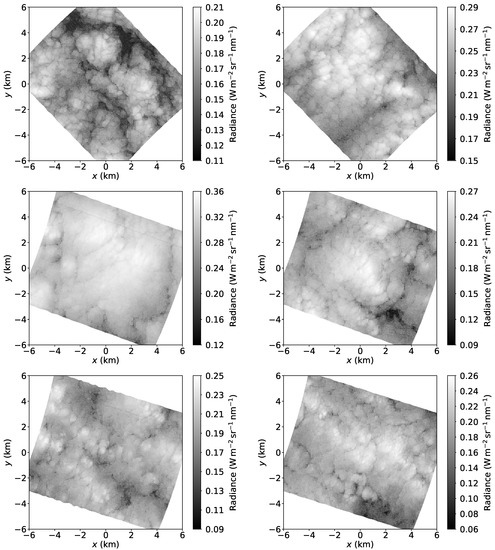 The large-eddy simulations are informed by the Sc radiance structure captured in images from the Airborne Multi-angle Spectro-Polarimetric Imager (AirMSPI) on NASA’s Airborne ER-2 Platform [26]. A sample of the AirMSPI images is shown in Figure 1. All images correspond to radiance fields of nadir views of the band observed during the ORACLES campaign on 22 September 2016 off the coast of Namibia [27]. Further details about the instrument and campaign can be found in Xue et al. [6]. The pixel resolution is and the scenes in Figure 1 are about wide. In spite of variations of cloud cover and intensity, the characteristic spiderweb structure is present in all images. The spiderweb is not present in the corresponding coarser resolution (25-m pixels) retrieved cloud properties images, suggesting that fine spatial resolution—less than about —is critical in discerning the spiderweb Sc structure.