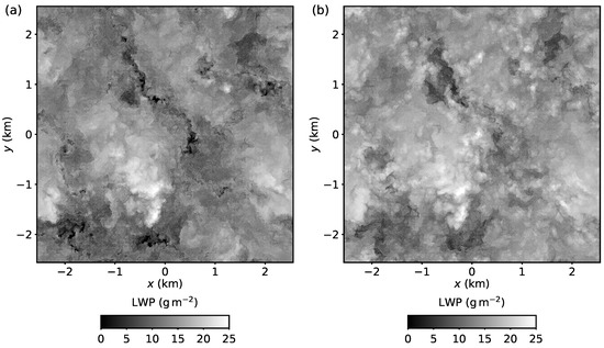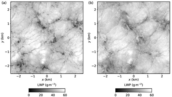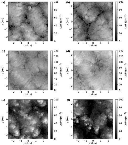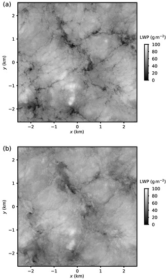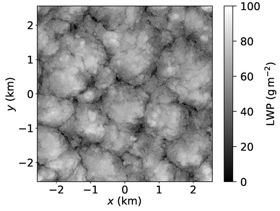 In situ observations (e.g., [10,11,12]) and high resolution LES [7,9] show complex three dimensional cloud structure. In this study, the cloud liquid water path—integrating the cloud-depth dimension to form a two-dimensional field—is primarily considered to simplify the exploration of the cloud spatial structure. Consideration of the LWP is not a significant limitation because of the stratiform nature of Sc. Only cloud macrophysical effects are considered and variations of LWP are only related to covariances of total water content, pressure, and temperature. For non-precipitating and non-drizzling Sc and model resolutions of 1–, this approximation is expected to result in sufficiently representative LWP spatial structure [9]. At smaller scales (centimeters), cloud microphysical effects can affect the local cloud liquid distribution. For instance, regions of low droplet concentration (and consequently low cloud liquid mixing ratios) can be created because of droplet inertial effects [13].