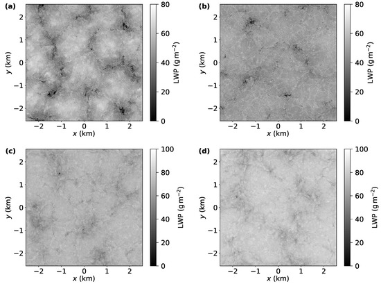 In Figure 2 and Figure 4, two time instances of LWP are shown at and . Cloud cover and LWP significantly decrease with respect to time in the case without radiation (B3), see [24]. Thus, additionally, LWP is shown in Figure 3 at . All panels in Figure 2, Figure 3 and Figure 4 exhibit the characteristic Sc lumpy structure. However, the spiderweb structure is absent from the LWP plots of cases without cloud-top evaporative cooling (Figure 2c,d and Figure 4c,d).