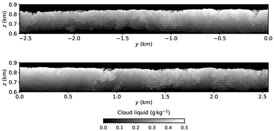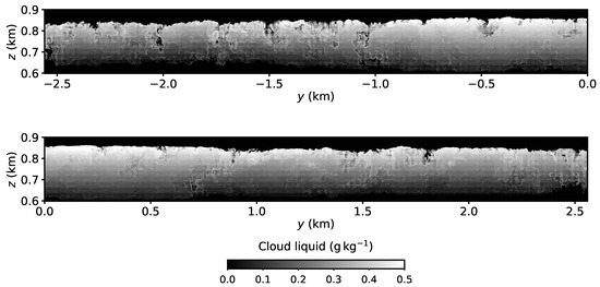 Cloud liquid mixing ratio on a vertical plain at for Case M1. The elongated domain is partitioned into two panels. Only the cloudy region is shown. The cloud-top slits are absent in Case M1 (c.f., Figure 6).