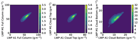 Figure 10 quantifies the differences in LWP between Cases A1 and M1. For each LWP column, the pairs of LWP of Cases A1 and M1 are recorded, i.e., –. Then, joint (two-dimensional) histograms of the LWP pairs are constructed in Figure 10 for the full column LWP, cloud-top LWP (), and cloud-bottom LWP (). The histograms lay across the diagonal for perfect correlations. The histograms are not symmetric about the diagonal and spread towards the higher values of Case M1. This is consistent with the LWP contours of Figure 5, Figure 6, Figure 7, Figure 8 and Figure 9 where LWP has higher values in Case M1 compared to Case A1 at the same location. This change in LWP is observed in all values but it is larger in low-LWP regions since the contours are broader for lower x-axis values in Figure 10. The effects are also present in the lower half of the cloud. However, the amount of cloud liquid is much less in this region. Therefore, even though the effects of modified buoyancy are present in the entire cloud, any impacts in the lower half of the cloud is likely limited because of the small cloud liquid content and the more random nature of the liquid structure.