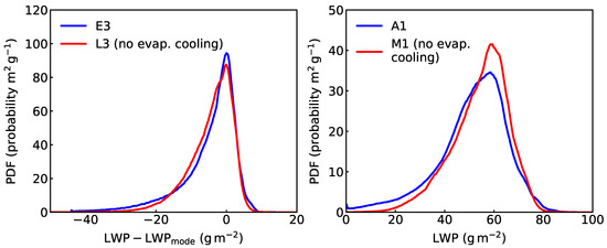 Probability Density Functions (PDF) of LWP for Cases E3 and L3 (left) and A1 and M1 (right). The LWP (x-axis) in the left panel is shifted by the location of the mode of the PDF.