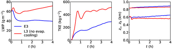 Even though evaporative cooling occurs primarily at the cloud top, it affects the bulk boundary layer dynamics. Comparison of time traces in Figure 12 of simulations driven only by radiative cooling (Cases E3 and L3) shows significant changes to the vertically integrated turbulent kinetic energy (TKE), mean LWP, and entrainment rate. In Cases E3 and L3, the cloud-top evaporative cooling enhances the entrainment rate. The entrainment rate is when evaporative cooling is suppressed (Case L3) and nearly doubles to in simulations with evaporative cooling. A comparison of the Case E3 time traces with the standard DYCOMS II RF01 and other physics-perturbation experiments are documented in [24].