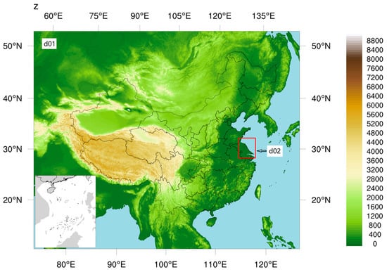 Nested grid of WRF models. The d01 grid contains most of China and the d02 grid contains the area of wind towers.