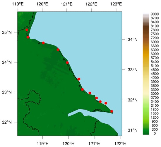 Domain 02 of the WRF model. There are 14 wind observation towers (red dots) distributed along the coastal area of Jiangsu province; each tower records 10 m above ground level (AGL), 30 m AGL, 50 m AGL, and 70 m AGL wind observations.