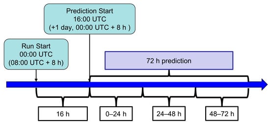 In China, every wind farm needs to provide wind power forecasts to the power grid. Every morning (UTC + 8 h), the wind farm needs to make a forecast of its own power generation for the next few days. The forecast time starts at 00:00 (UTC + 8 h) of the next day and lasts for several days. Therefore, our WRF model starts running at 00:00 (UTC) every day, and the result starting at 16:00 UTC (+1 day, 00:00 UTC + 8 h) every day is taken as the result of wind speed forecast of the wind farm, where the output interval of the WRF model is 10 min. Figure 3 shows the WRF running time configuration. We start the WRF model every day and make 24, 48, and 72 h forecasts. The model runs from 1 June 2009 and continues until 27 June 2010. From the results of the WRF model, we have 24, 48, and 72 h wind speed forecasts every day over the time range of one year.