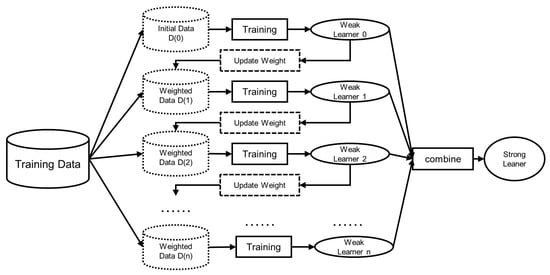 Boosting is one such ensemble method [52,53]. At the beginning of boosting training, a weak learner is trained with a training data set with initial weights. The weights of the training data set are updated, according to the learning error performance of weak learner. The update of the weights makes the weights of the training samples with high learning errors higher. These poor samples will get more attention in the weak learners, later in the training process. After updating the weights, the GBDT algorithm continues to train new weak learners, based on the updated training data set. This is repeated until the number of weak learners reaches a predetermined number; finally, these weak learners are integrated through a collection strategy to obtain the final strong learner. Figure 4 shows the total process of the boosting algorithm.