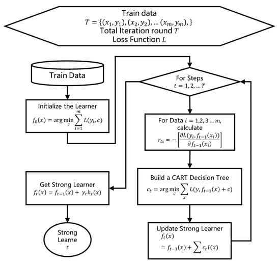 The other boosting algorithm, GBDT, iterates by calculating gradients [59,60]. Using the CART decision tree, we can perform multiple training iterations, where each iteration trains a new CART decision tree based on the training data after the updating of the weights. The GBDT algorithm can be expressed by the formula